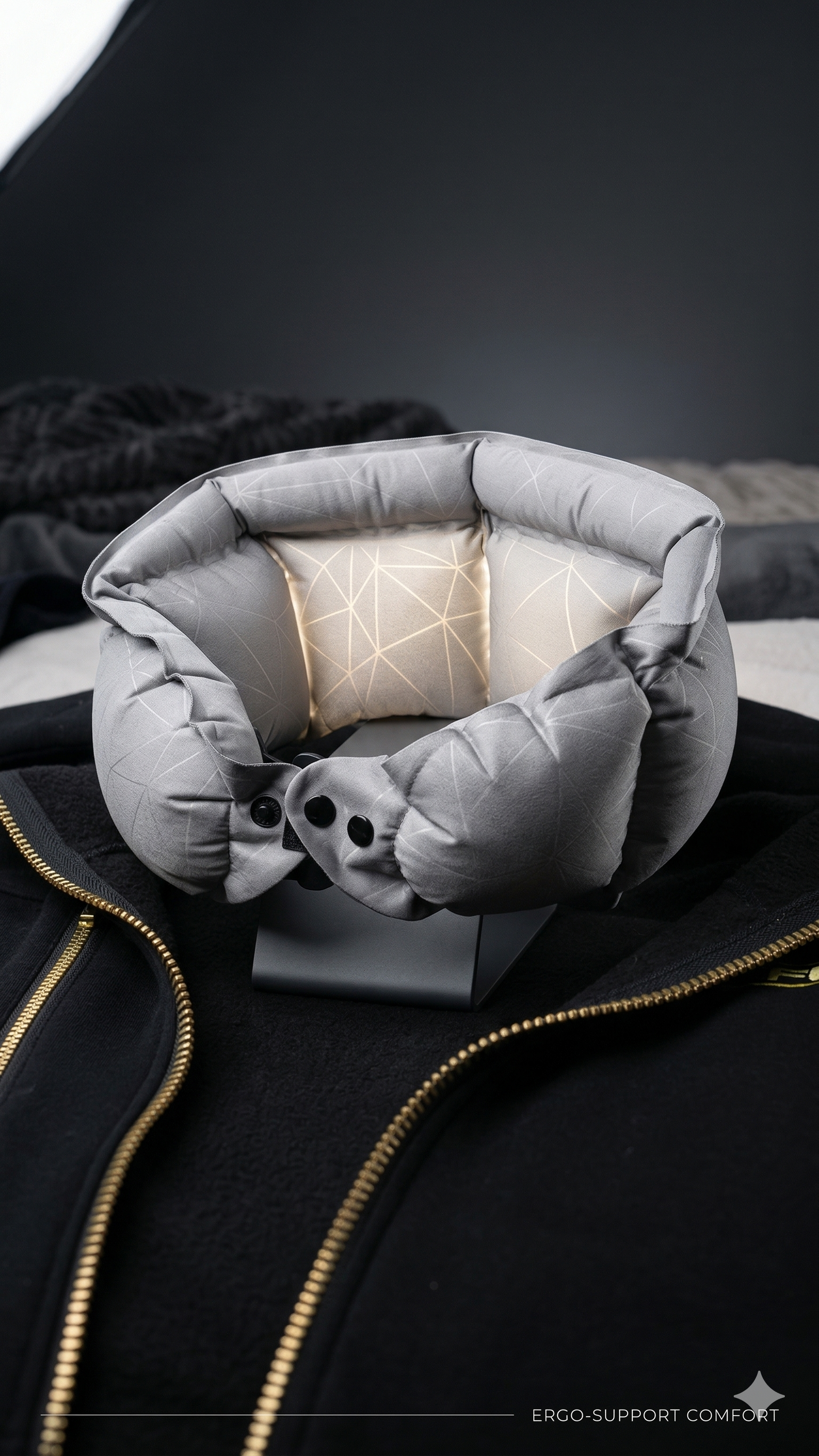 Not a generic U-shape. A custom-wrap neck collar with welded geometric air chambers to distribute pressure evenly and lock alignment with a velcro strap.